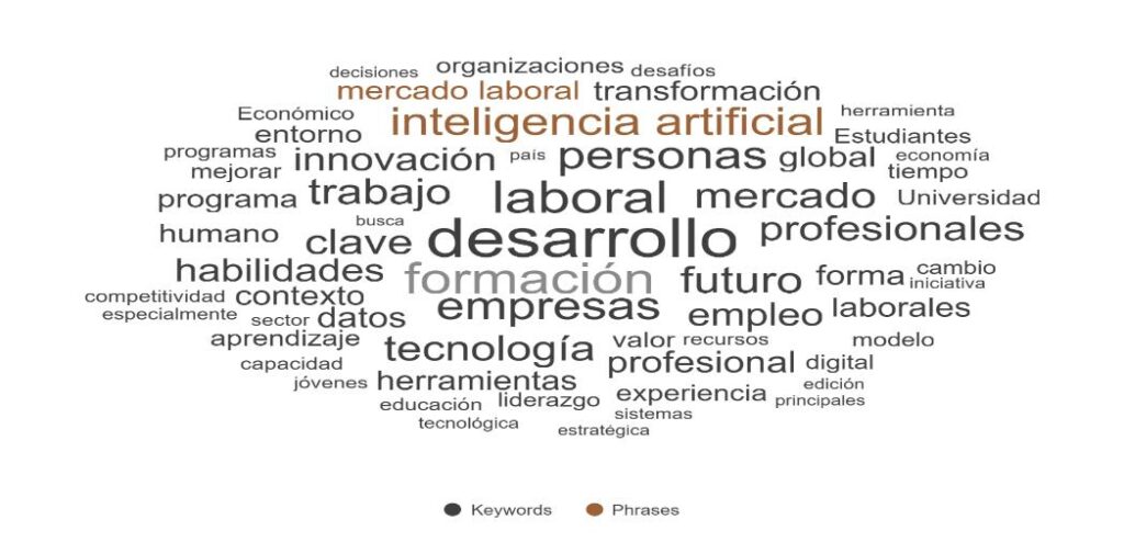 El sentimiento general hacia los efectos de la IA en el empleo es neutral, destacando en la siguiente nube de palabras derivada de la escucha social, los términos mercado laboral y transformación digital: