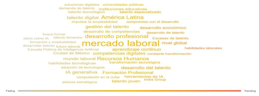 Algo similar ocurre con los trending topics, donde la IA se posiciona como una palanca estratégica para transformar el mercado laboral a través del desarrollo del talento, las competencias digitales y el aprendizaje continuo, con impacto económico y social global.